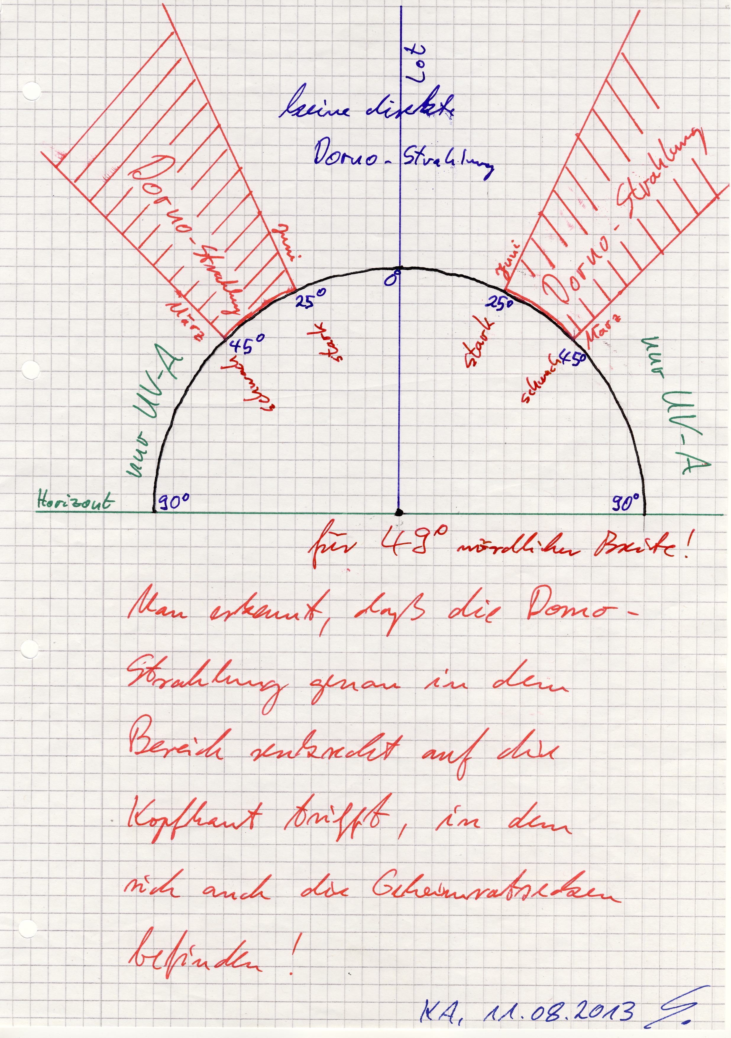 Im Frühjahr (März/April) ist die Intensität der UVB-Strahlung noch gering und daher wird bei Sonnenbestrahlung der Haut in nördlichen Breiten bei kurzen Bestrahlungszeiten noch keine vollständige Sättigung der Produktion von Prävitamin D3 in der Haut erreicht. Die Ursache dieses Phänomens ist die starke Absorption von UVB-Strahlung in der Ozonschicht beim schrägen Durchgang durch die Atmosphäre. Es kommt also nur sehr wenig UVB-Strahlung auf der Erdoberfläche an, solange die Sonne weniger als circa 45 Grad über dem Horizont steht. Dieser Umstand bewirkt, dass die UVB-Strahlung im Verlauf eines Jahres bevorzugt unter ganz bestimmten Einfallswinkeln als Direktstrahlung auf der Kopfhaut auftrifft. Betrachten wir zum Beispiel die Situation am 49. Breitengrad (in Karlsruhe oder Paris). Wenn man im Scheitelpunkt der Schädelkalotte das Lot errichtet und dann die Haupteinfallsrichtungen der UVB-Strahlung in einem Kugelkoordinatensystem ermittelt, so ergibt sich, dass im Juni am Sommeranfang die UVB-Strahlen um die Mittagszeit unter einem Winkel (Poldistanzwinkel oder Sonnenzenitwinkel "Theta" vom Lot ab gemessen) von circa 25 Grad einfallen. Dieser erste Grenzwinkel ergibt sich einfach aus dem höchsten Sonnenstand am Sommeranfang, wenn man die Winkel-Differenz zwischen der geografischen Breite (im Beispiel 49 Grad) und dem nördlichen Wendekreis (etwa 23,4 Grad) berechnet: 49 Grad - 23,4 Grad = 25,6 Grad. Wenn die Sonne tiefer steht, so wird die UVB-Strahlung immer mehr abgeschwächt, so dass bei einem Sonnenzenitwinkel von etwa 45 Grad die zweite Grenze liegt. Dieser zweite Grenzwinkel wird im April und September gerade noch erreicht und sein genauer Wert wird durch die Höhe des Standortes über dem Meeresspiegel bestimmt. Im Hochgebirge kann dieser Grenzwinkel deutlich größer sein (z. B. 55 Grad). Die Situation am 21. Juni eines Jahres (Sommeranfang) ist schematisch in der folgenden Skizze dargestellt. Die Dorno-Strahlung fällt also am Sommeranfang in einem schmalen Winkelbereich zwischen circa 25 Grad und 45 Grad (immer vom Lot ab gemessen) als Direktstrahlung ein. Wenn man den Schädel nun um das Lot herum rotieren lässt, so ergibt sich bei senkrechter Projektion des angegebenen Winkelbereiches auf die unbedeckte Kopfhaut eine optimal mit Dorno-Strahlung bestrahlte Fläche, die wie ein Kranz um den Kopf geschlungen ist. Für Winkel unter 25 Grad tritt praktisch keine direkte Dorno-Strahlung auf und für Winkel über 45 Grad ist der Anteil der Dorno-Strahlung sehr klein, so dass im Winkelbereich von 45 Grad bis zum Horizont (90 Grad) hauptsächlich UVA-Strahlung auftritt. Die UVA-Strahlung trägt jedoch nicht zur Produktion von Prävitamin D3 bei. Diese Betrachtung macht klar, warum die männliche Glatze zur Absorption von UVB-Strahlung optimal geformt und ausgerichtet ist und sie macht plausibel, warum die Entwicklung der männlichen Glatze meist mit den sogenannten Geheimratsecken beginnt. Die Geheimratsecken liegen ziemlich genau in dem angegebenen Winkelbereich von 25 bis 45 Grad, in dem die Dorno-Strahlung mit maximaler Wirkung (senkrecht) auf der Kopfhaut auftrifft. Die nackte Kopfhaut ist unter diesen Bedingungen als UVB-Kollektor besonders gut geeignet, weil beim aufrechten Gang im Freien praktisch immer ein Hautbezirk auf der Schädelkalotte zur Sonne hin ausgerichtet ist. Die schwache UVB-Strahlung im Frühling kann bei vorhandener Glatze also optimal zur Bildung von Prävitamin D3 genutzt werden. Im April trifft die UVB-Strahlung nur in einem sehr schmalen Winkelbereich um 45 Grad herum (plus/minus circa 5 Grad) senkrecht auf der Kopfhaut auf. Dies wird durch eine Computersimulation der natürlichen UVB-Strahlungsverhältnisse im Frühling (etwa am 15. April um die Mittagszeit in Karlsruhe) besonders deutlich gezeigt. In der Simulation sind die Bereiche der Kopfhaut, in denen statistisch die höchsten Konzentrationen von Prävitamin D3 zu erwarten sind, gelb eingefärbt. Das kranzförmige Bestrahlungsmuster auf dem Oberkopf zeigt, warum sich die Geheimratsecken seitlich am Oberkopf nach hinten ausbreiten. Die voll ausgebildete männliche Glatze kann deshalb nach Form und Ausrichtung als ein natürlicher UVB-Kollektor betrachtet werden. Die genaue Form der Glatze wird einerseits durch die Kopfform und andererseits durch die Bewegungen des Kopfes im UVB-Strahlungsfeld bestimmt und sie ist damit der Berechnung mit Hilfe mathematisch-statistischer Methoden zugänglich.